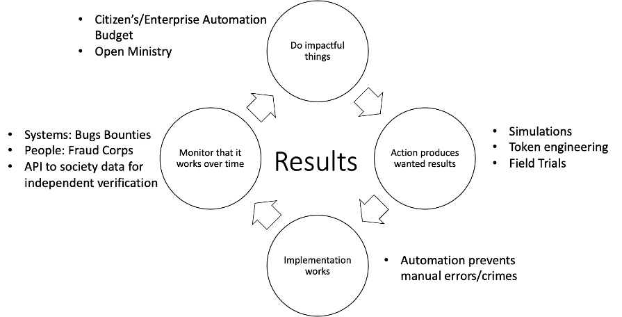 Proposals that also work in field trials go for decision making and if approved, get implementation. Implementations ideally need to be automated. This because automations prevent manual errors or manual misuses of the laws. If there is requirement for private enterprises to do anything, a reference implementation is created as a showcase that the policy is implementable.
