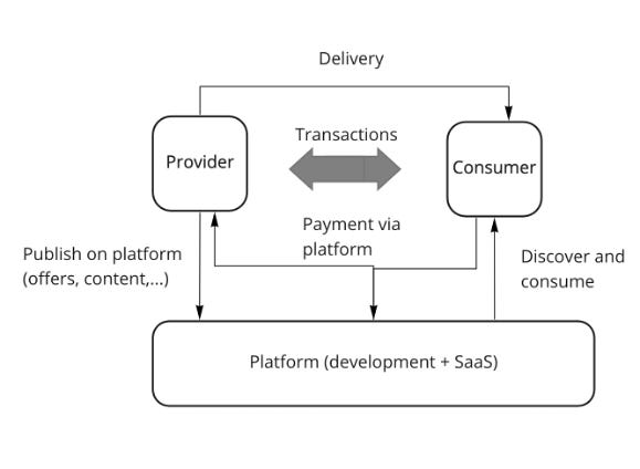 On a very high level a platform can be seen as a service where the provider can publish their offer or post their content. Users use the discovery functions to select suitable offer and purchase it. The payment goes through the platform and the platform takes their fees from the payment. The service or product delivery happens outside of the platform.