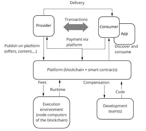 This means that the single platform functionality is split into multiple parts. One set of teams develops the platform code further, another set of parties run the nodes where the code executes and different teams develop user interfaces and algorithms on top of the blockchain data and code. Often the platform sets up a fund or non-profit association that gets a small percentage of revenue. This is used for further development and for grants so that new development teams can join the project.
